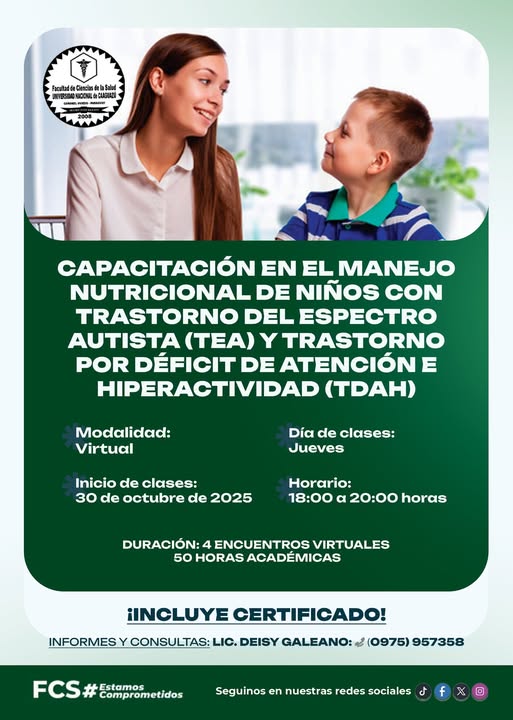 La Facultad de Ciencias de la Salud – Universidad Nacional de Caaguazú invita a docentes, profesionales y estudiantes del área de la salud a participar de la Capacitación en el manejo nutricional de niños con Trastorno del Espectro Autista (TEA) y Trastorno por Déficit de Atención e Hiperactividad (TDAH).