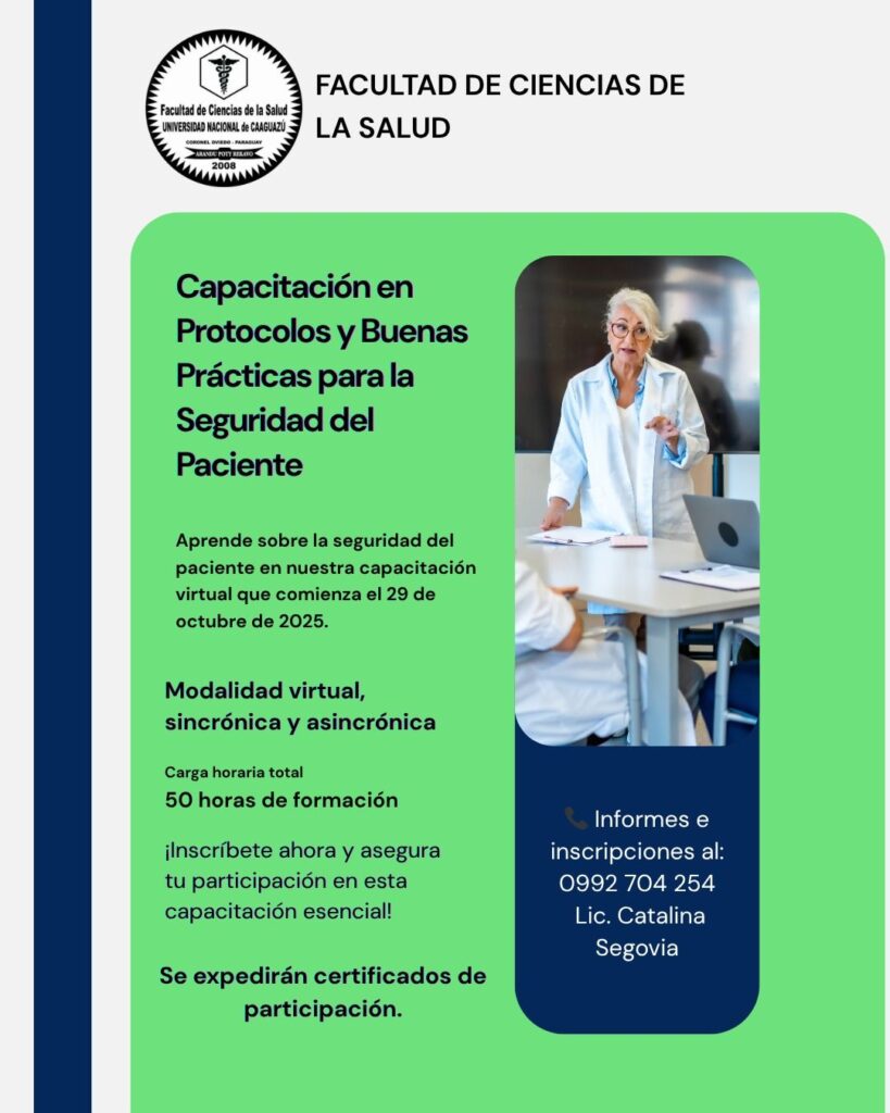 La Facultad de Ciencias de la Salud – Universidad Nacional de Caaguazú invita a profesionales y estudiantes del área de la salud a participar de esta capacitación virtual, orientada a fortalecer los conocimientos y habilidades en torno a la seguridad del paciente y la aplicación de protocolos actualizados de atención.