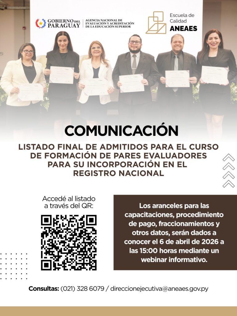 por su admisión al proceso de formación de pares evaluadores, según el listado final de admitidos comunicado por la Agencia Nacional de Evaluación y Acreditación de la Educación Superior (ANEAES).
