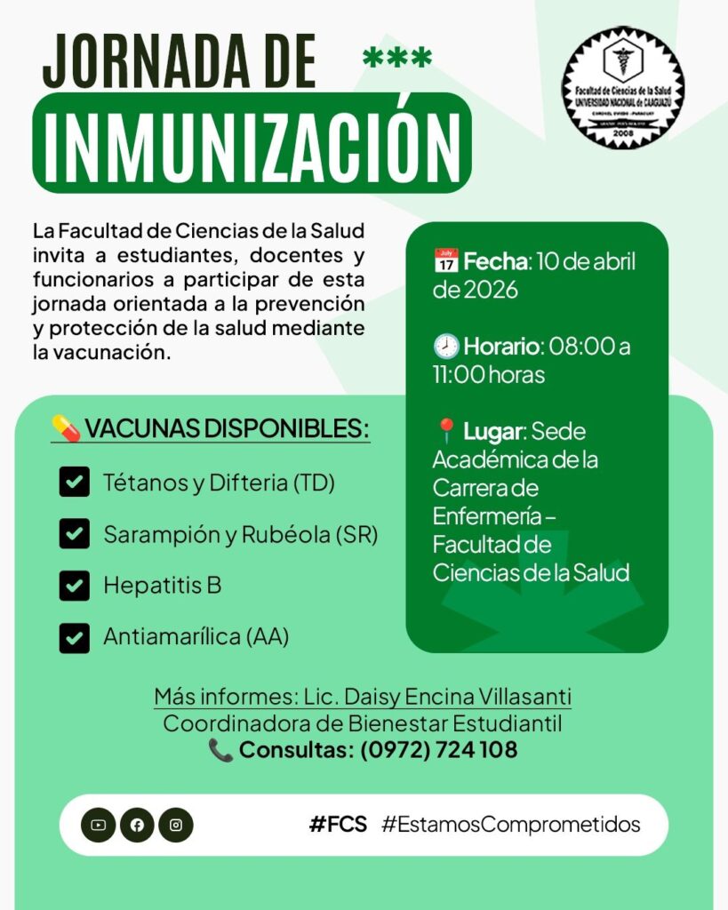 La Facultad de Ciencias de la Salud invita a estudiantes, docentes y funcionarios a participar de esta importante jornada orientada a la prevención y protección de la salud mediante la vacunación. ![]()
