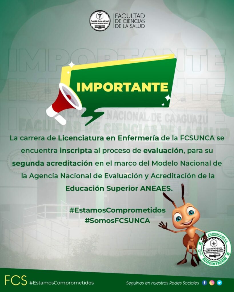 IMPORTANTE|| Comunicamos a la población en general que la carrera de Licenciatura en Enfermería de la FCSUNCA se encuentra inscrita al proceso de evaluación, para su #segunda#acreditación en el marco del Modelo Nacional de la Agencia Nacional de Evaluación y Acreditación de la Educación Superior #ANEAES.#EstamosComprometidos#SomosFCSUNCA