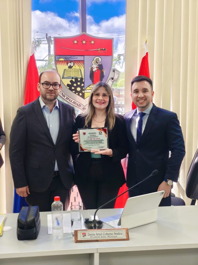 La Junta Municipal de Coronel Oviedo otorgó un reconocimiento especial a la Mgtr. Rosa Noemí Espínola Martínez, decana de la Facultad de Ciencias de la Salud de Universidad Nacional de Caaguazú (UNCA), por la acreditación de las carreras Enfermería y Nutrición de la Facultad ante la Agencia Nacional de Evaluación y Acreditación de la Educación Superior (ANEAES).