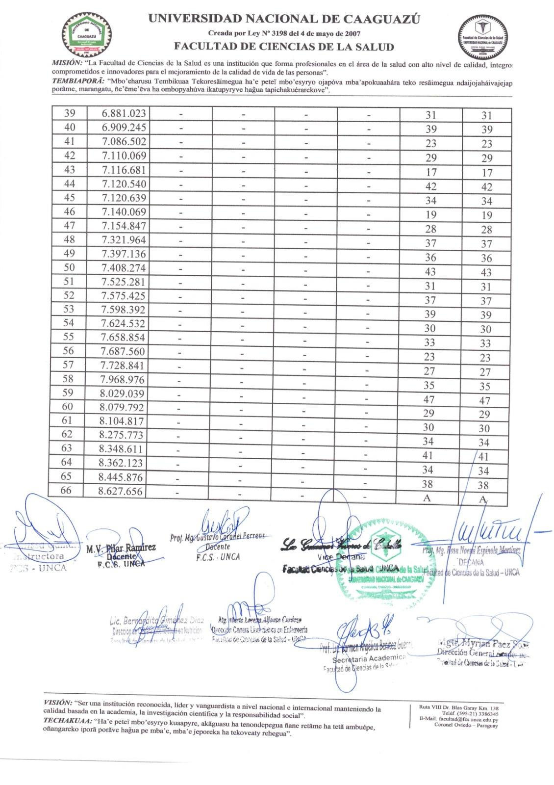 En las planillas publicadas se encuentran registrados los postulantes por número de cédula de las carreras de Enfermería y Nutrición, conforme al procedimiento de evaluación establecido.